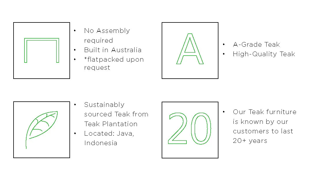 Affordable Prices : We supply the finest quality teak furniture at the best prices from our Melbourne showroom. All our furniture is delivered fully assembled for your convenience (flat packs can be made available on request).
