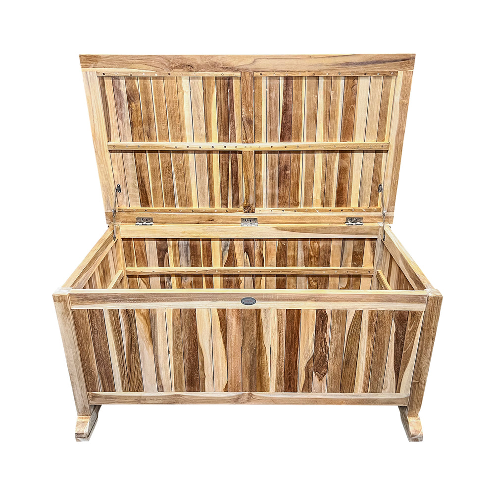 Our Newest Arrival, The Teak Outdoor storage box complete with cushion is the perfect addition to any outdoor area. Can also be used as a bench or serving table.