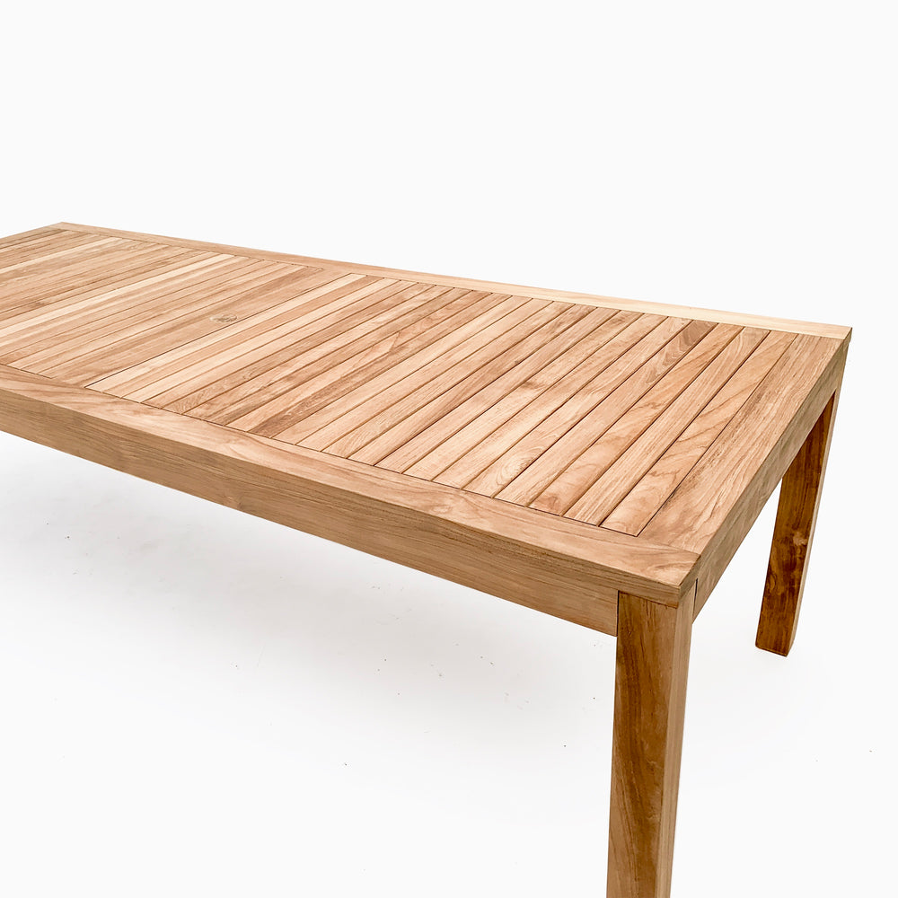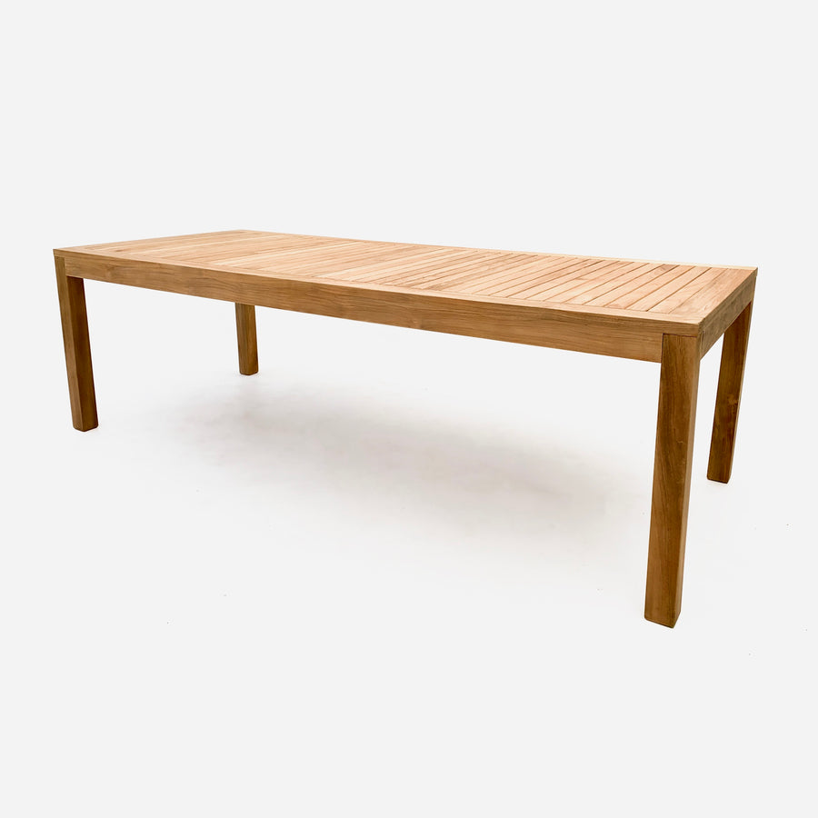 This solid classic is designed to stand the test of time. Made from A-Grade marine-quality plantation teak, our Deluxe Dining Tables are naturally weather resistant and perfect for indoor or outdoor use. Available in nine different sizes and capable of sitting up to 16 people, they are ideal for any dining or casual entertaining area. They feature a beautiful horizontal slatted top finished with a stylish sidebar and solid legs. Handmade and rock solid, these tables are designed to last with minimal maintenance.